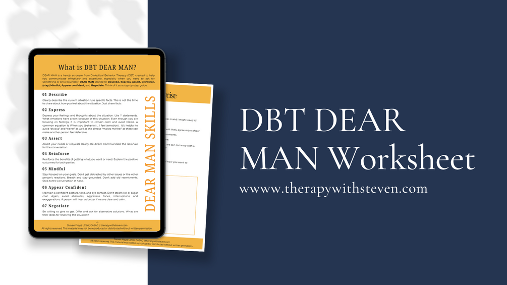 DEAR MAN is a handy acronym from Dialectical Behavior Therapy (DBT) created to help you communicate effectively and assertively, especially when you need to ask for something or set a boundary. Think of it as a step-by-step guide for how to communicate effectively. In this 4-page handout, we'll cover the DEAR MAN steps and put them into practice through reflection exercises.